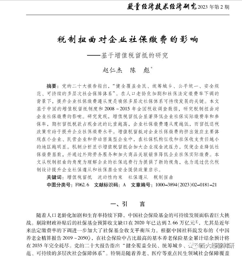 近日,bevictor伟德经济学系副教授赵仁杰作为第一作者的论文在《税制扭曲对企业社保缴费的影响——基于增值税留抵的研究》在中国人文社会科学权威期刊《数量经济技术经济研究》2023年第2期发表,该文是赵仁杰副教授主持的国家自然科学基金青年项目、陕西省社会科学基金项目的阶段性成果。