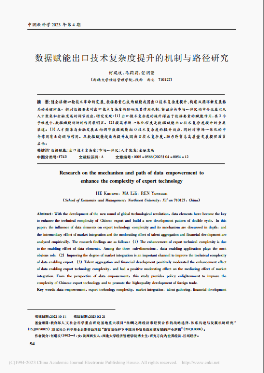 近日,bevictor伟德博士生何琨玟、马莉莉教授以及硕士生任玥萱合作的学术论文《数据赋能出口技术复杂度提升的机制与路径研究》在国内权威期刊《中国软科学》2023年第4期发表。伴随全球新一轮技术革命的发展,数据要素已成为赋能我国出口技术复杂度提升、构建双循环新发展格局的关键所在。对此,本文深入探讨数据要素对出口技术复杂度的影响及其作用机制,实证分析市场一体化的中介效应以及人才聚集和金融发展的调节效应。研究发现:第一,出口技术复杂度的提升得益于数据要素的赋能作用,其三个子维度中,数据赋能应用的作用最明显。第二,提高市场一体化程度是数据赋能出口技术复杂度提升的重要渠道。第三,人才聚集与金融发展正向调节数据赋能出口技术复杂度的提升效应,同时对市场一体化的中介作用有正向调节作用。本研究从数据赋能视角为提升我国出口技术复杂度、助力对外贸易高质量发展提供了政策启示。