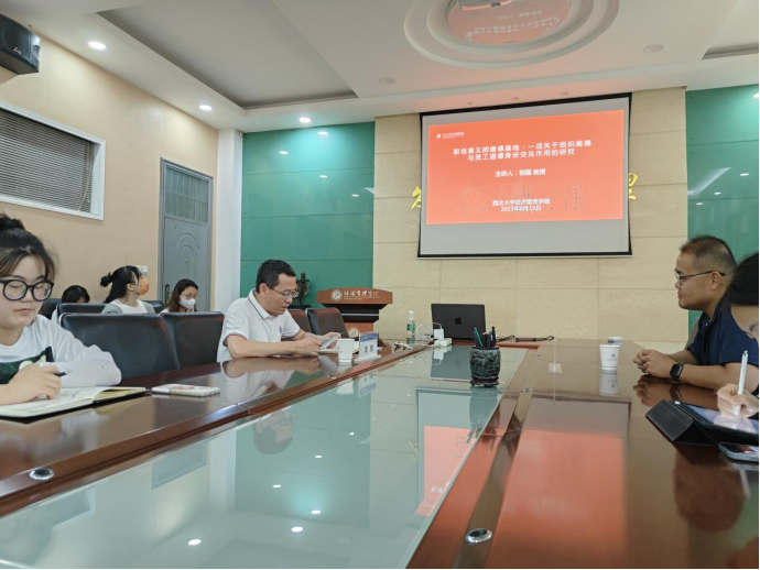 6月13日下午,bevictor伟德名家讲坛系列学术讲座在学院一楼会议室成功举办。该讲座由学院副经理李辉教授主持,特邀加拿大多伦多约克大学祝磊教授做了题为“职场意义的道德基础:一项关于组织美德与员工道德身份交互作用”的学术讲座。学院教师,硕、博士研究生等共计40余人参与了本次讲座。祝教授从自己对职场意义和工作的理解入手,简要概括了今天所要分享的内容。首先,祝教授从自我和工作环境两个方面介绍了工作意义的来源。紧接着详细阐述了道德认同、组织美德的含义以及这两者与意义之间的联系,从而提出了第一个假设:组织美德缓和了道德认同和工作意义之间的关系,因此,当组织美德越高时,关系会越牢固。然后,祝教授又提出了道德行为在三者之间发挥的作用,提出了第二和第三个假设。关于课题组所用到的研究方法,祝教授从问卷设计、问卷发放网站、量表设计等方面展开详细陈述。最后,祝教授简要介绍了该课题的研究成果,并向在座老师和员工们强调了问卷收集过程中的一些问题以及解决办法。