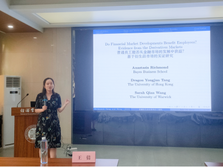 会议分为上下半场,在上半场中,王倩副教授首先讲解了其最新科研成果——《金融市场发展对员工有利吗?来自衍生品市场的证据》。该工作论文研究金融衍生品交易与员工福利的基本关系,以详实的微观证据,展示了公司股票期权与信用违约掉期(CDS)交易如何通过降低管理层短视主义来促进员工多方面福利的提升。随后,王倩副教授与公司师生就该论文的选题、写作思路、方法、数据等进行了研讨。