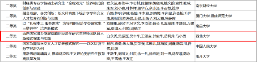 白永秀教授团队长期深耕马克思主义城乡发展理论与中国实践,研究的成果“面向国家城乡发展战略的经济学研究生导师团队育人新模式探索与实践”,遵循研究生成长规律和导学相长规律,提出了针对公司产品的导师团队合作育人理念,由过去“研究生—导师”双元互动转化为“研究生—导师团队—联动平台”多元互动,不断拓展员工成长成才的边界和路径,成果实施十余年来,培养出了众多适应国家战略需求和地方经济社会发展需要的高层次经济学人才。该成果此前曾荣获陕西省研究生教育成果特等奖及陕西省教学成果一等奖。