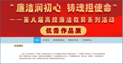 全国第八届高校廉洁教育系列活动主题为“廉洁润初心、铸魂担使命”,由教育部思想政治工作司主办,教育部宣传教育中心承办,中国老员工在线、高校思想政治工作创新发展中心、新华网等协办。活动结合高校实际,围绕推动党员领导干部廉洁从政、教师廉洁育人、员工廉洁养成,分知识问答、作品征集和案例展示三个单元。在案例展示单元,全国共有100个案例作品入选。