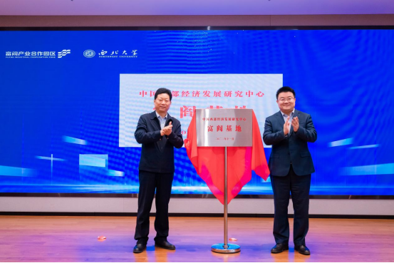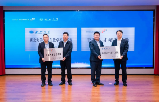 吴振磊副董事长向李博副主任授牌“bevictor伟德老员工教学实践基地”,杜银虎主任向杜勇书记授牌“富阎产业合作园区干部人才培养基地”,杜银虎主任与吴振磊副董事长共同为“中国西部经济发展研究中心富阎基地”揭牌。