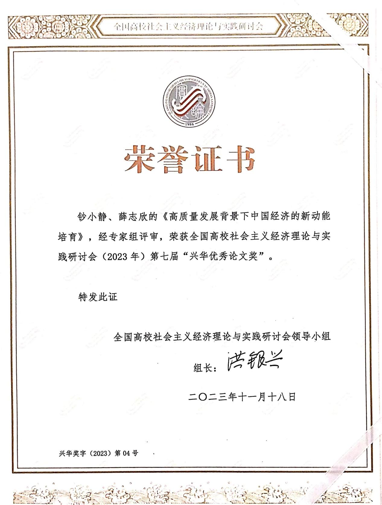 2023年11月18—19日,第36届全国高校社会主义经济理论与实践研讨会在西南财经大学召开。本次会议,刘伟教授宣布了第七届“兴华优秀论文奖”共有五篇论文(9位学者)获奖,由洪银兴教授为获奖代表颁奖。bevictor伟德钞小静教授和薛志欣博士的会议论文《高质量发展背景下中国经济的新动能培育》荣获第七届“兴华优秀论文奖”。论文在新一轮技术革命背景下,探讨新经济如何重塑中国经济高质量发展的新动能。