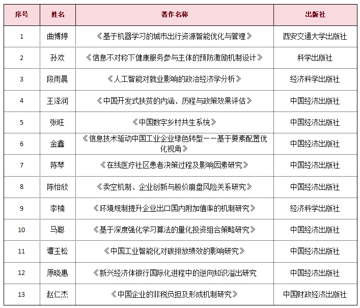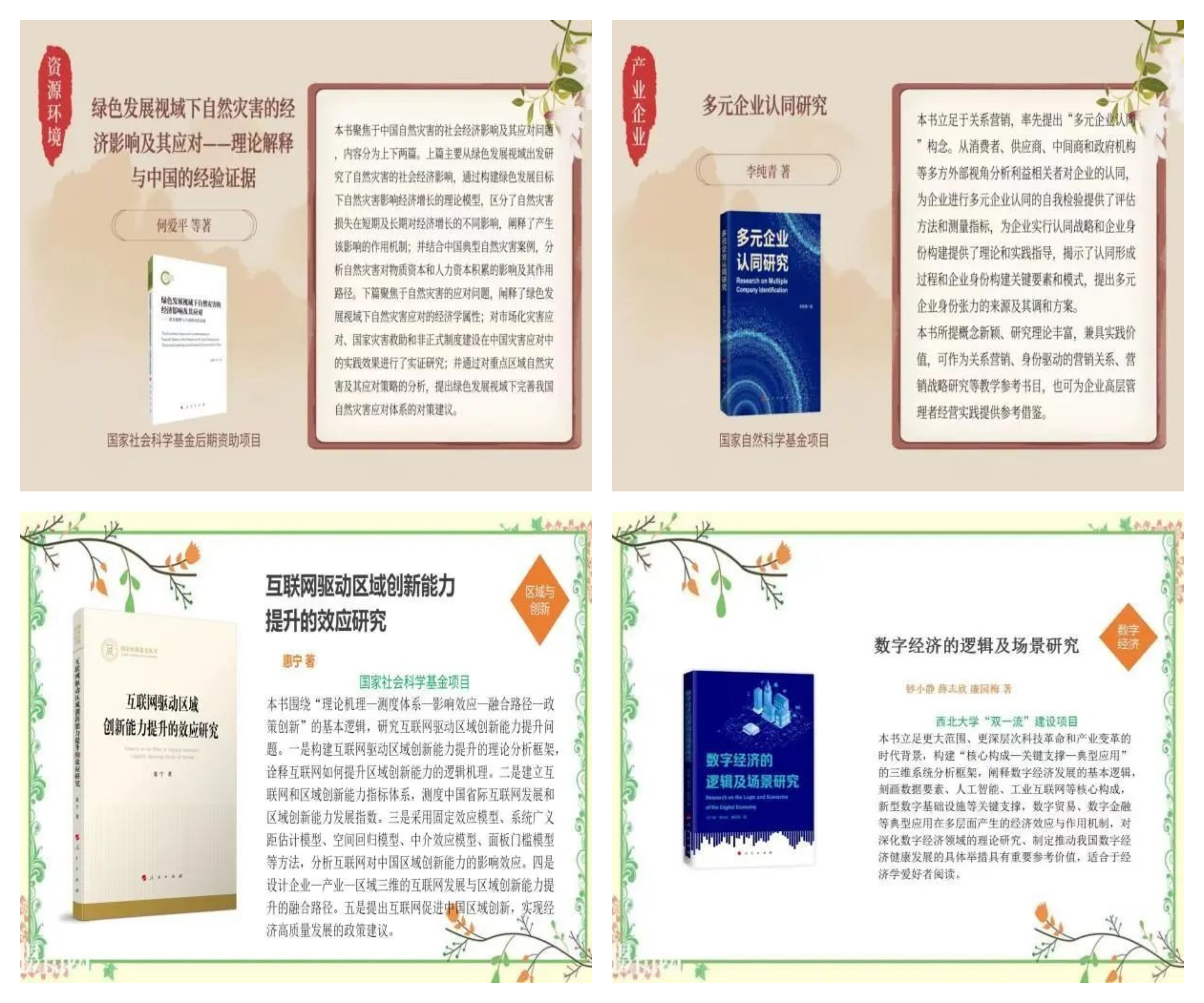 2023年全年在人民出版社、三联出版社、社会科学文献出版社、科学出版社等出版学术专著共18部,其中《绿色发展视域下自然灾害的经济影响及其应对——理论解释与中国的经验证据》、《多元企业认同研究》、《互联网驱动区域创新能力提升的效应研究》《数字经济的逻辑及场景研究》等多部著作获得人民出版社季度好书榜推荐。