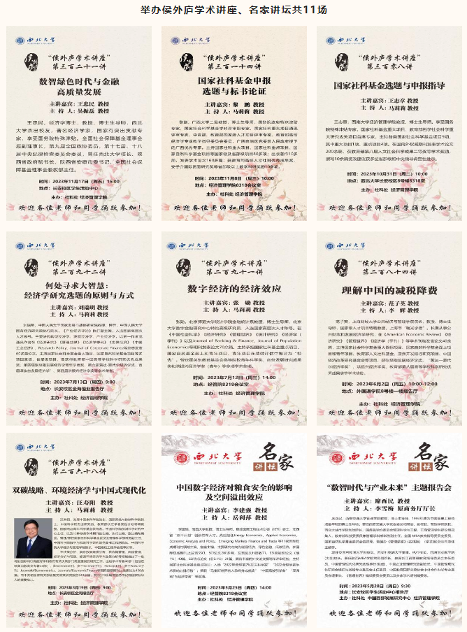 积极承办第二届中国特色社会主义政治经济学青年学者论坛、第二届西部乡村振兴论坛、高质量发展与制度创新学术论坛、第九届中国经济增长与发展青年学者论坛、“一带一路”倡议十周年与中国式现代化学术研讨会、中国特色社会主义政治经济学理论与实践研讨会、共建“一带一路”:引领中外合作高质量发展 开拓陕西对外开放新路径国际研讨会、中国文旅融合发展论坛暨丝绸之路经济带文旅深度融合发展研讨会、《中国西部发展报告(2023)发布会暨中国西部发展论坛》等高水平学术会议共9场。