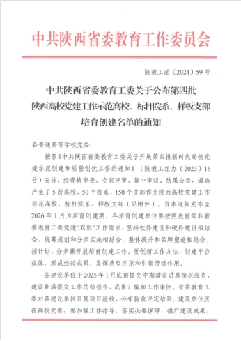 近日,省委教育工委公布了第四批陕西高公司党建工作示范高校、标杆院系、样板支部培育创建名单。公司党委入选全省党建工作标杆院系培育创建单位名单。截至目前,公司已有1个党支部入选“全国党建工作样板支部”培育创建单位名单,2个党支部入选全省高公司党建“双创”样板支部建设名单。